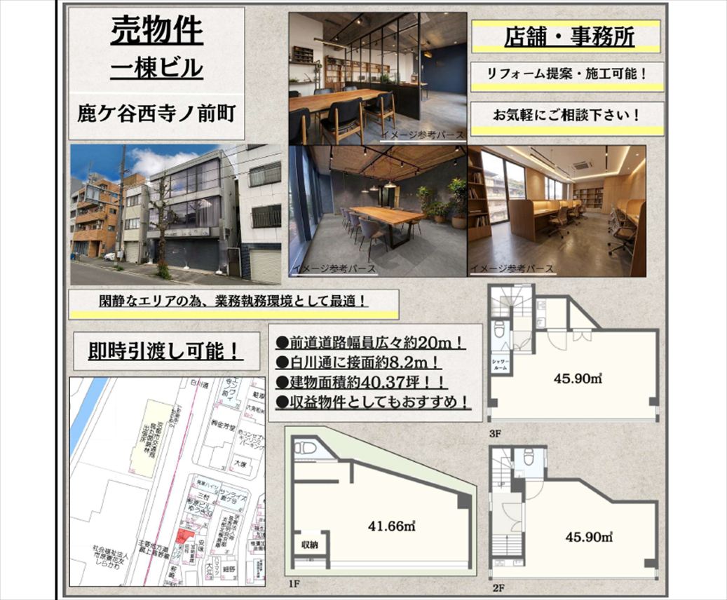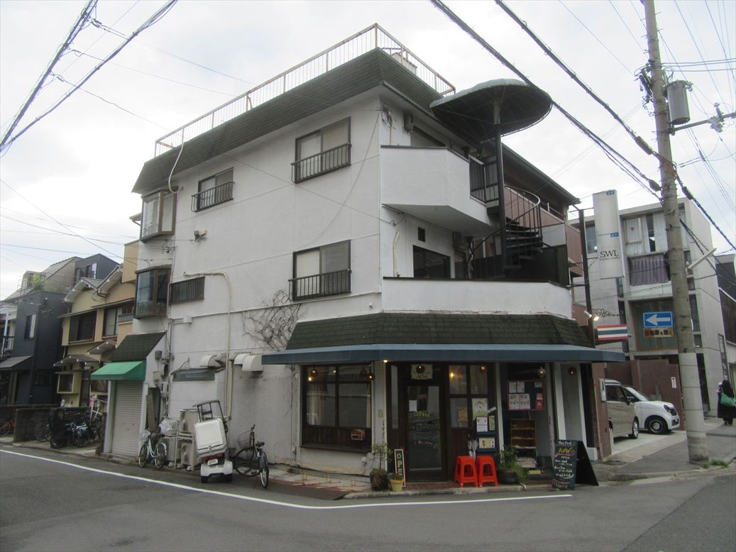 注目: 現在賃貸中のオーナーチェンジ物件です。 一乗寺公園の北西・徒歩2分、曼殊院通りの一筋南、高原通り面しの南東角地に建つ中古鉄骨造3階建て店舗付事務所です。 200mほど西にいくと飲食店も多い東大路通り。高野や修学院にも出やすく、またその界隈はスーパーや銀行や病院・薬局等があり、生活便利な立地です。