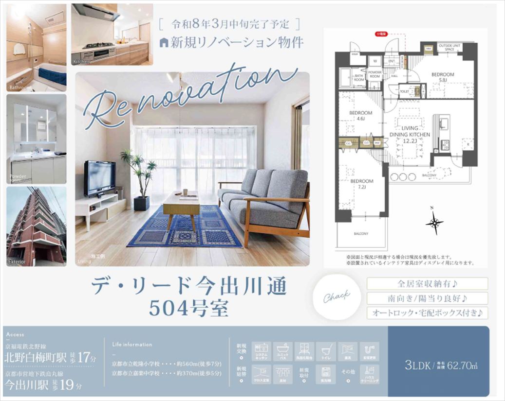注目: 千本今出川の東側、今出川通り面しの11階建てマンションの5階、62.7㎡、3LDK、南向きバルコニーのお部屋で日当たり良好です。2026年3月中旬にリノベーション完了予定です。 周辺には業務スーパーやイオンスタイル西陣小町、セブンイレブンや郵便局、クリーニング店など生活に便利な店が多くあります。西陣千本商店街までは徒歩3分です。また、市バスは多方面にアクセスしていますので、お出かけもラクラクです。