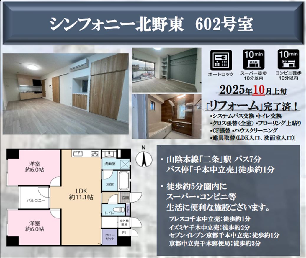 注目: 千本中立売の交差点にある9階建てマンションの6階、50.73㎡、2LDK、西向きバルコニーのお部屋です。2025年10 月上旬にリフォームが完了しています。 お買い物は徒歩1分のところにあるコレモ千本中立売店や徒歩2分のところにあるイズミヤ千本中立売店、すぐ近くの北野商店街などが便利でしょう。 また、正親小学校まで徒歩4分と近いのでお子様の通学も安心です。
