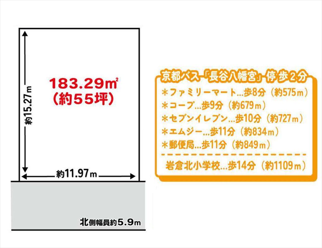 注目: 長谷八幡宮 の北西・徒歩5分のところにある北向きの建築条件付売土地です。土地面積55.37坪、間口11.97m、奥行15.27m、前面道路幅員5.9m、閑静な住宅地にあります。 お買い物は、徒歩9分・車で2分のところにあるコープいわくら、徒歩10分・車で2分のところにあるエムジーショップ岩倉店やAコープ岩倉店などが便利でしょう。また、そのあたりには銀行や郵便局などもありとても便利です。 詳しくは青伸ホームまでお気軽にお尋ねください♪