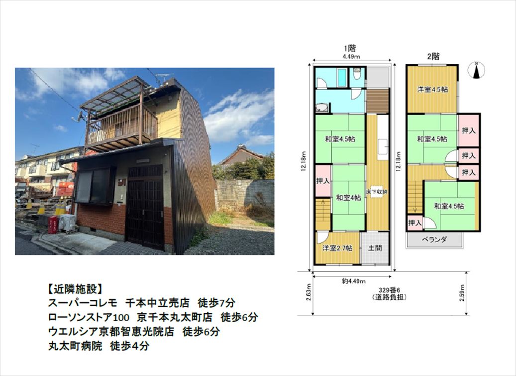 注目: 七本松通と下立売通の交差点の北東・徒歩2分、新出水通り面しにある南向きの地に建つ中古木造2階建住宅です。土地面積19.15坪、間口4.49m、延床面積24.69坪、6Kの間取りのお家です。前面道路幅員は2.59mです。 お買い物は、コレモ千本中立売店・徒歩7分、イズミヤ千本中立売店・徒歩10分、千本商店街や北野商店街などが便利でしょう。仁和小学校までは徒歩10分です。